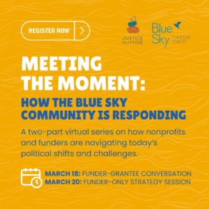 In March, Blue Sky partnered with Justice Outside to co-host Meeting the Moment, a two-part series designed to help the field navigate an antagonistic federal administration rapidly dismantling equity-focused policies and defunding critical work. The goal was urgent, yet simple: create space for nonprofits to speak candidly about what they are experiencing, and for funders to listen, reflect, and strategize on how to respond together.